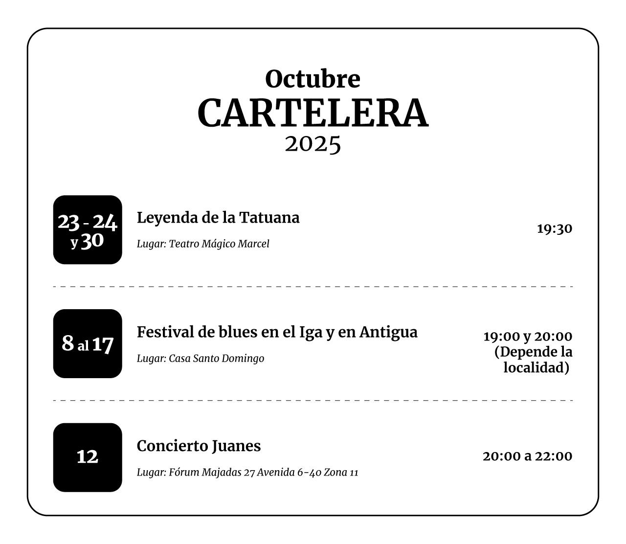 ![]() Noches de terrorEl Recorrido de Leyendas de Guatemala 2025 celebra 10 años de existencia. Se realizará el 24, 25 y 31 de octubre, además del sábado 1 de noviembre, en el Cerrito del Carmen de 19:00 a 23:30 horas., con salidas cada 10 minutos y recorridos de una hora. Es una experiencia inmersiva de miedo, narraciones y misticismo, guiada por personajes que revelan nuevas leyendas, escenarios, efectos y experiencias interactivas. | ![]() Carne, fuego y leyendaEl Portal del Ángel celebra 25 años como referente de la parrilla en Guatemala, un restaurante de cortes premium, servicio atento y ambiente cálido donde familias y amigos crean recuerdos. Su salón y detalles invitan a conversaciones largas, mientras la terraza respira ciudad y madera. En su aniversario propone maridajes que resaltan sabores. Recomendación sugerida: Prime de lomito con Carmen Gran Reserva Carménère, combinación de jugosidad, estructura y final sedoso persistente. |